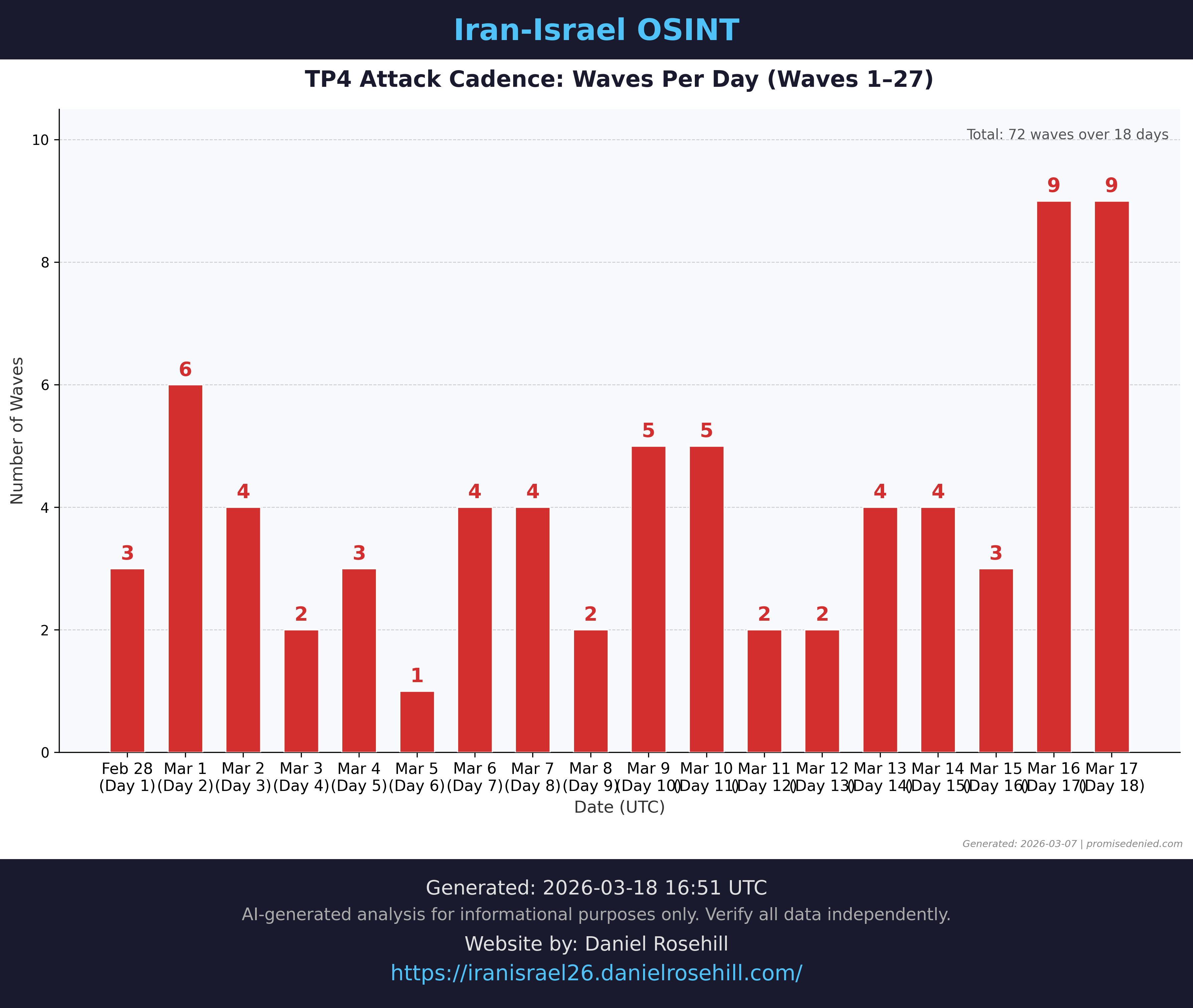 - Leadership transition — no operational pause: The succession of Mojtaba Khamenei as Supreme Leader on March 8 produced zero disruption to TP4 operations. Wave 30 launched the following morning, demonstrating that either the transition was pre-planned with operational continuity built in, or that IRGC Aerospace Force command authority operates with sufficient autonomy to sustain campaign tempo independent of political transition timelines. The "Labbaik Ya Khamenei" codename in Wave 31 explicitly signals military loyalty to the new leader.