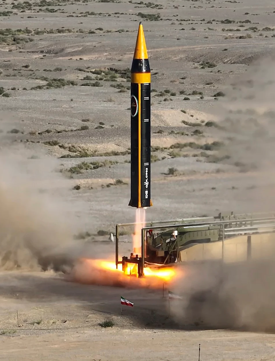 Iran's heaviest-warhead MRBM: a 1-ton payload liquid-fuel missile derived from the Shahab-3/BM-25 lineage, claimed MIRV-capable by the IRGC.